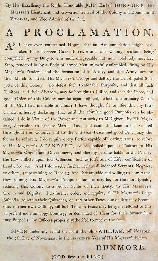 Murray, John. “Lord Dunmore’s Proclamation (1775).” Lord Dunmore’s Proclamation. Encyclopedia Virginia, December 7, 2020. https://encyclopediavirginia.org/entries/lord-dunmores-proclamation-1775/.